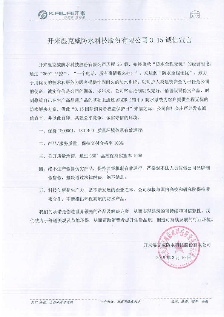 開來濕克威防水科技股份有限公司歷程26載,始終秉承“防水全程無憂”的經(jīng)營理念,通過“360°品控”、“一個電話,所有事情我來辦!”,來達(dá)到“防水全程無憂”。致力于用優(yōu)良的技術(shù)和服務(wù)為顧客提供牢固耐久的防水系統(tǒng)。以呵護(hù)人類建筑安全為己任是公司的使命,誠實守信是公司的訓(xùn)條,多年來,公司堅決抵制以次充好,銷售假冒偽劣產(chǎn)品,時刻鞭策自己在生產(chǎn)高品質(zhì)產(chǎn)品的基礎(chǔ)上通過ARMOR(鎧甲)防水系統(tǒng)為客戶提供全程無憂的防水解決方案。借此“3.15國際消費(fèi)者權(quán)益保護(hù)日”來臨之際,公司向社會莊嚴(yán)地發(fā)布誠信宣言,并以此自律,共建公平競爭、誠實守信的環(huán)境。