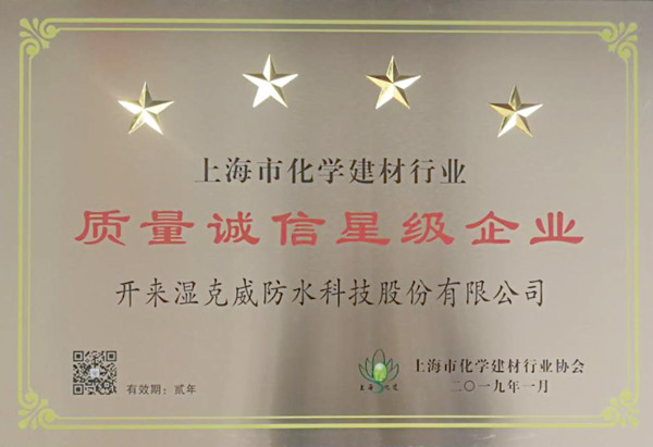 上海市化學建材行業(yè)協(xié)會第七屆第三次會員代表大會于2019 年2月 28 日 召開,備受業(yè)界矚目的“上海市化學建材行業(yè)質(zhì)量誠信星級企業(yè)”名單如期揭曉。開來濕克威防水科技股份有限公司榮獲“質(zhì)量誠信四星級企業(yè)”稱號。