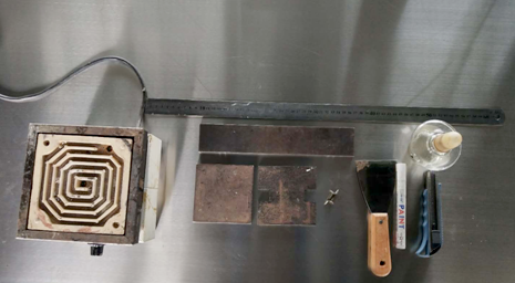 鼓風烘箱、熱電偶、夾子、光學測量裝置(刻度至少0.1mm)、金屬圓插銷的插入裝置(內徑約4mm)、直尺、記號筆、壁紙刀、模型、卷材。