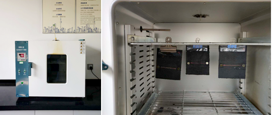 制備好的試件垂直懸掛在烘箱的相同高度,間隔至少30mm。此時烘箱的溫度不能下降太多,開關烘箱門放入試件的時間不超過30S。放入試件后加熱時間為(120±2)min。